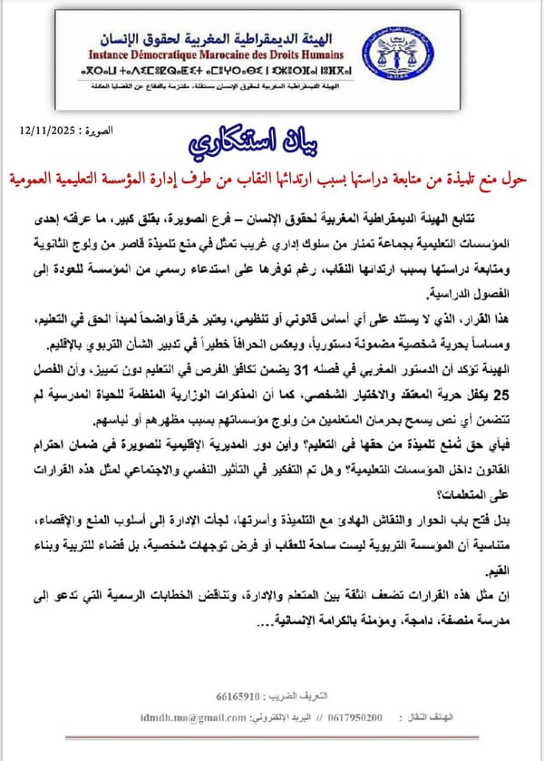 سلوك إداري غريب تمثل في منع تلميذة قاصر من ولوج الثانوية ومتابعة دراستها بسبب ارتدائها النقاب منذ يومين • 1 دقيقه مقروئه