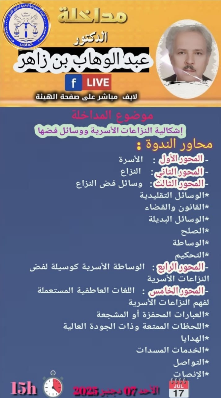 إشكالية النزاعات الأسرية و وسائل فضها ٥ ديسمبر ٢٠٢٥ اشترك في نشره موقعنا احصل علي احدث المشاركات في بريدك الالكتروني عنوان بريدك الالكتروني اشتراك Now check your inbox and click the link to confirm your subscription. Please enter a valid email address Oops! There was an error sending the email, please try later. الهيئة الديمقراطية المغربية لحقوق الإنسان