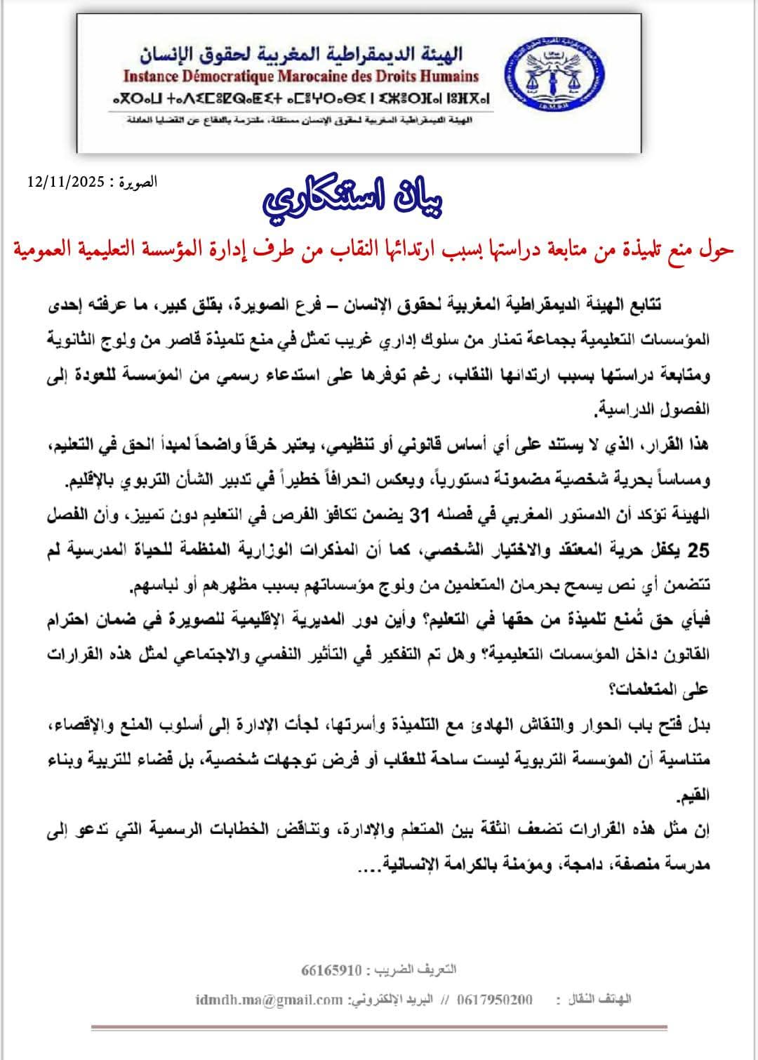و في الاخير تؤكد أن كرامة المتعلمة لا يمكن المساس بها تحت أي مبرر، وأن المدرسة المغربية يجب أن تبقى فضاء للعلم، لا مجالاً للإقصاء ، وستعمل الهيئة على رفع الملف إلى الجهات الجهوية والوطنية المختصة، ومتابعته ميدانياً وقانونياً إلى حين إنصاف المتضررة وضمان احترام القانون وروح العدالة في كل المؤسسات التعليمية بالإقليم.